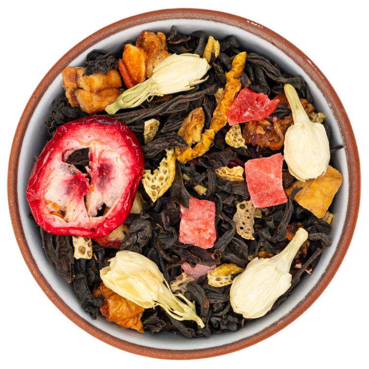Состав черный чай, гибискус, кусочки яблока, цукат ананаса, цедра апельсина, кусочки клюквы, апельсин чипсы, цветы жасмина, гвоздика, ароматизатор |
